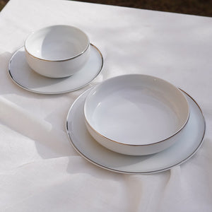 A timeless dinner set designed for elegant everyday dining and refined hosting. Featuring a smooth white finish accented with a delicate silver rim, this set brings effortless sophistication to every table. Perfectly balanced between modern minimalism and classic luxury, it complements any dining space and elevates both casual meals and special gatherings.