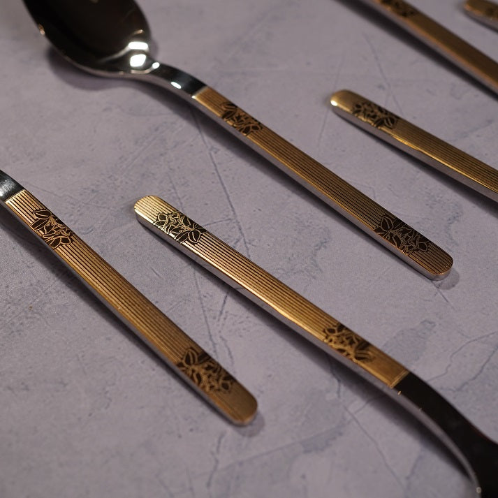 Elegant stainless steel dinner spoons with golden engraved handles. Smooth, durable, and perfect for soups, rice, and stews.