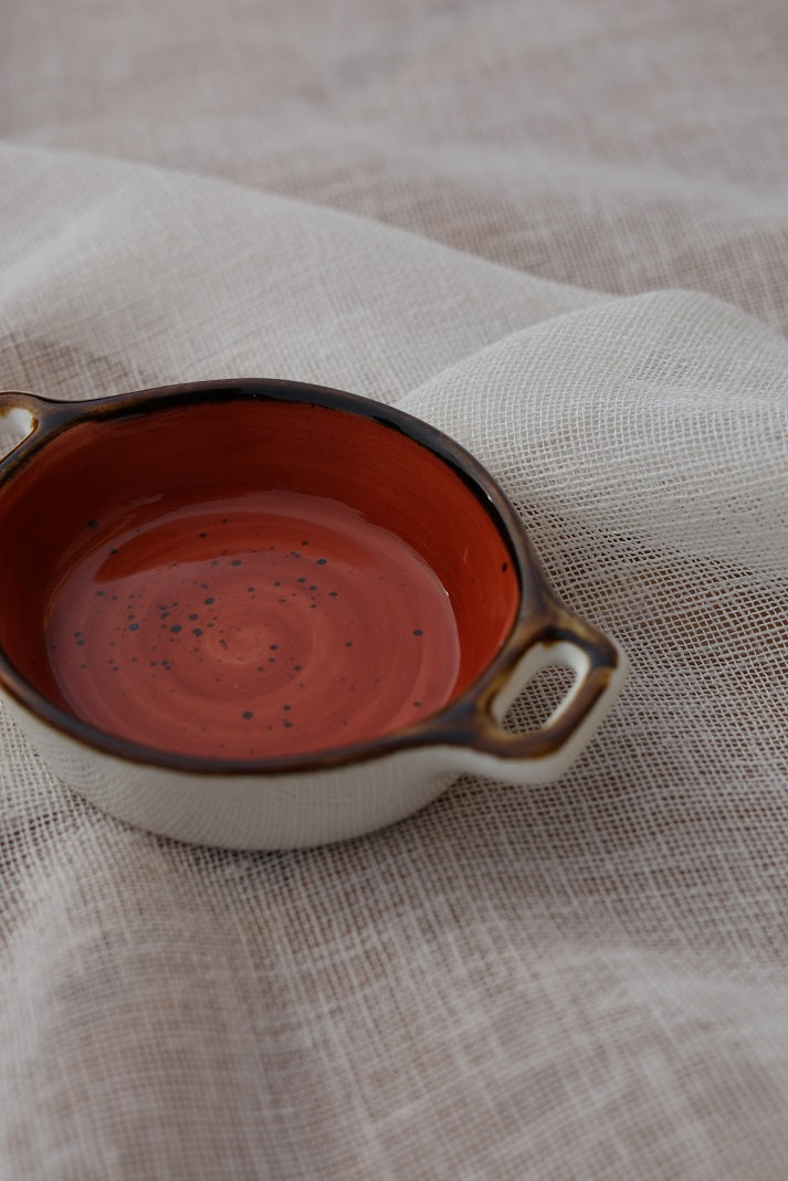 A tiny handled bowl with soft speckles and a gentle rustic finish. Ideal for mini desserts, melted chocolate, butter portions, sauces or dips small yet full of elegance.