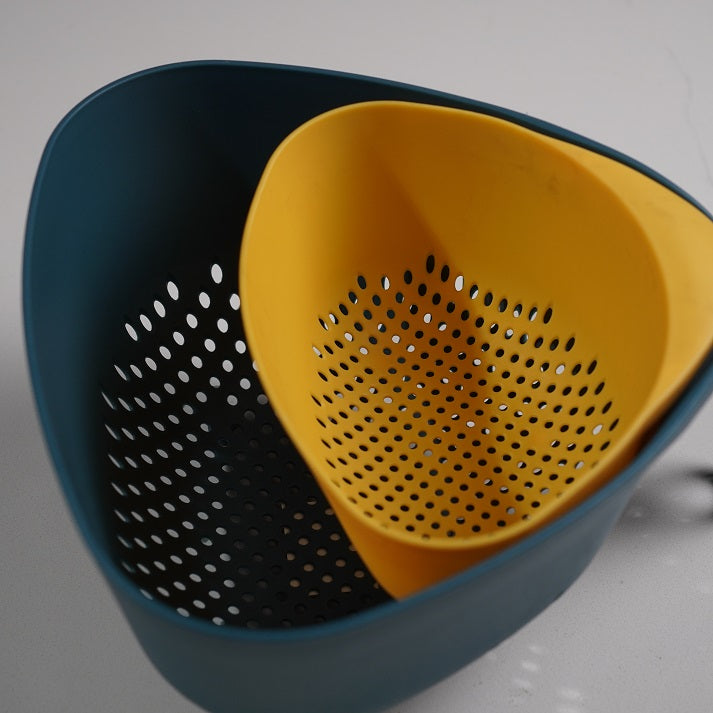 A smart two-piece colander set in teal and vibrant yellow. Designed for easy rinsing and draining of fruits, vegetables, and pasta with stackable convenience.