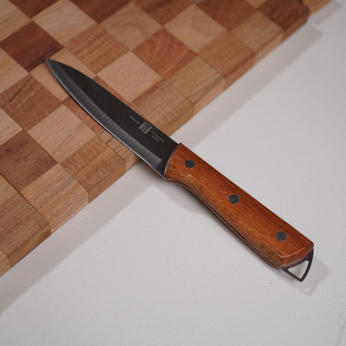 A sharp stainless steel utility knife with a durable black or white or brown handle. Ideal for precision cutting, chopping, and slicing in everyday kitchen tasks.