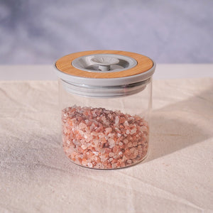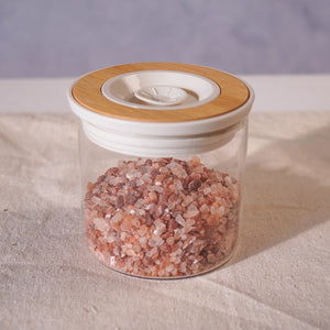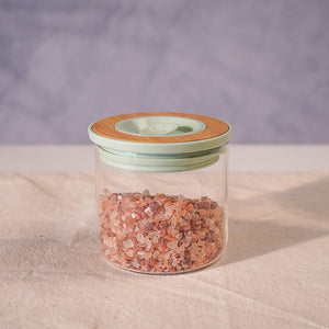 يحافظ على أملاحك وتوابلك ووجباتك الخفيفة محفوظةً تمامًا. غطاؤه المزين بالخيزران، ذو اللمسة الباستيلية، يضفي سحرًا على كل رف، بينما يحافظ تصميمه المحكم على النضارة والنكهات القوية.