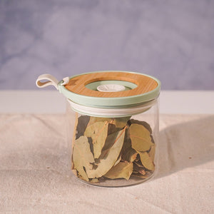 يحافظ على أوراق الغار مقرمشة وعطرية. بغطائه المصنوع من الخيزران، وختمه الأخضر النعناعي، وخطافه الجانبي العملي، يُشكّل مزيجًا مثاليًا من الأناقة والتخزين للكنوز الطبيعية في مخزنك.