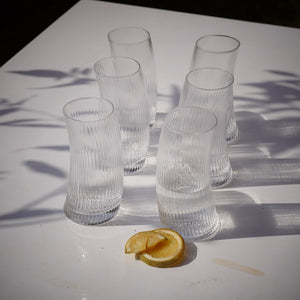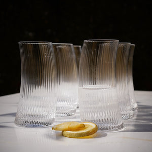 A refined set of tall glasses featuring subtle vertical detailing for a modern, elegant look. Lightweight yet sturdy, they are perfect for serving soft drinks, sparkling water, or cocktails.