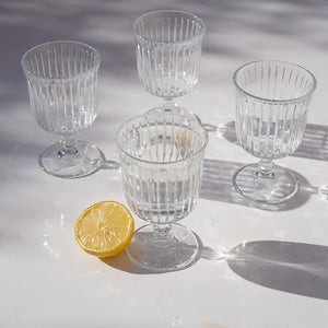 A modern twist on classic glassware. These ribbed goblets feature a refined pedestal stem and crystal-clear shine, perfect for juices, cocktails, desserts, and table styling.