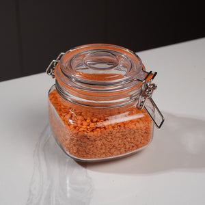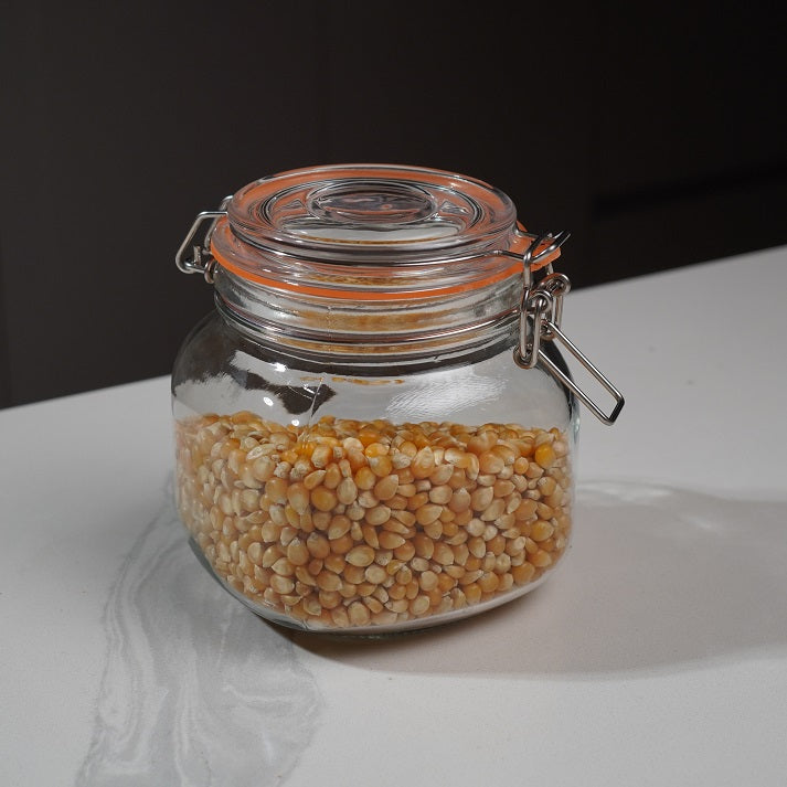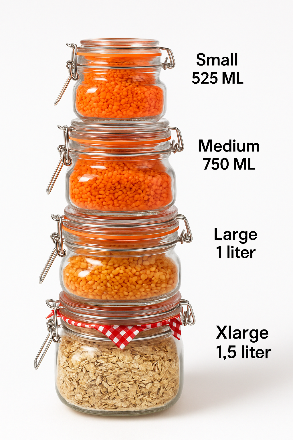 A wide-mouth glass jar with a classic red gingham clip-top lid. Perfect for storing oats, pasta, spices, or homemade preserves while adding a rustic farmhouse touch to your kitchen.