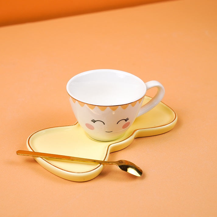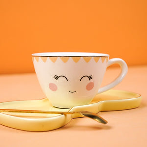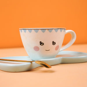 Enjoy drinking your favorite beverage with this elegant set, which includes a mug, a bow-shaped saucer, and a stainless steel spoon.