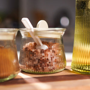Elegantly ribbed for a timeless look, this four-piece glass set includes spice jars and a dispenser for oil or vinegar. A graceful blend of form and function for your counter or table.
