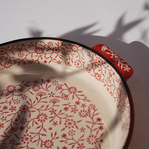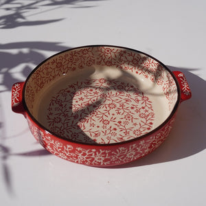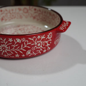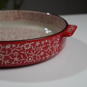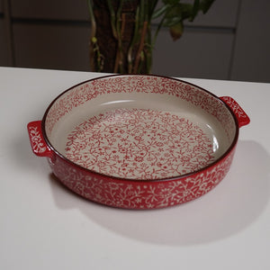 A round porcelain baking dish with a red floral design. Perfect for pies, gratins, and family-style servings straight from the oven.