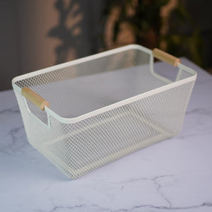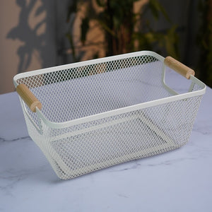 A sleek ivory mesh basket with bamboo-style handles. Perfect for storing fruits, snacks, or kitchen cloths with a touch of Scandinavian charm.