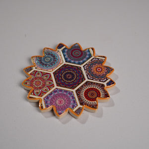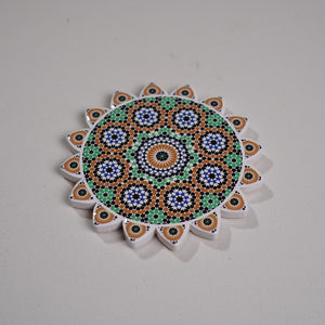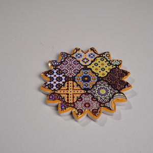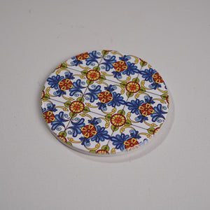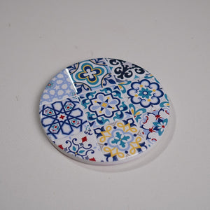 A vibrant round ceramic coaster featuring colorful mosaic-inspired patterns. Perfect for protecting your surfaces while adding a touch of artistic flair to your table setting.