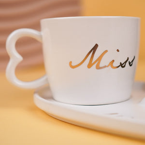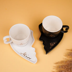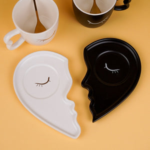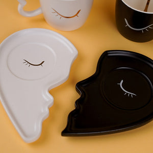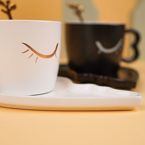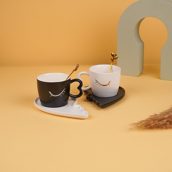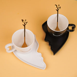 This charming set of two porcelain mugs showcases a playful contrast with one black and one white mug, each resting on a uniquely shaped saucer that fits together like puzzle pieces. The whimsical, minimalist face design on both mugs adds a touch of personality, while the gold-toned leaf-shaped spoons complement the set's artistic vibe, making it perfect for a stylish coffee or tea experience.