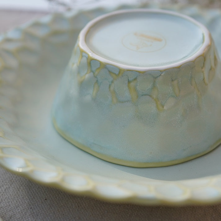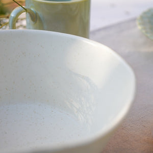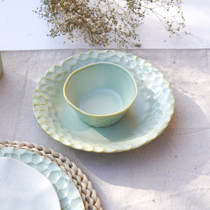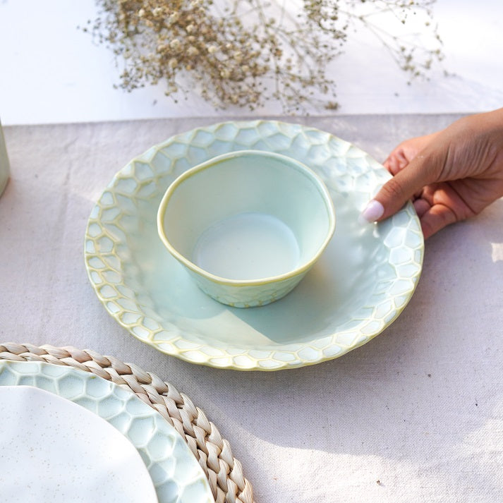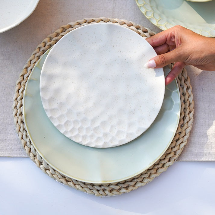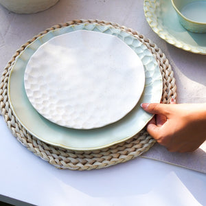 The Luxe Texture Stoneware Dinner Set brings a perfect blend of artisanal craftsmanship and modern elegance to your table, elevating every meal into a refined dining experience." The dinner set is an elegant and textured design with a neutral, off-white color and light green palette. The plates have a hammered, slightly raised pattern, giving them a rustic yet refined look. The set includes large dinner plates, smaller salad or dessert plates, bowls, and matching mugs. There is also a stylish oval serving dish, perfect for appetizers or side dishes. The set’s smooth, glossy finish contrasts beautifully with the subtle textures, creating a sophisticated yet versatile look suitable for both casual and formal dining occasions.