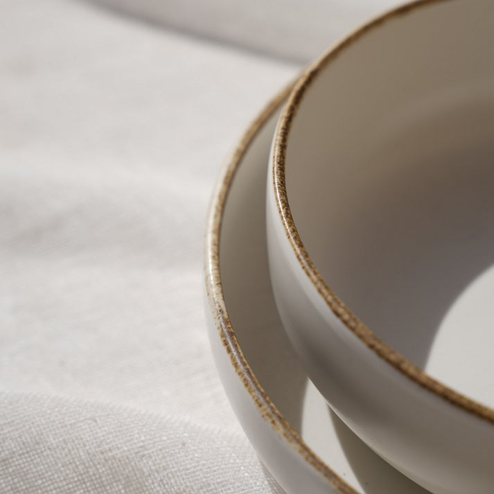 Soft rounded shapes finished with a subtle handcrafted rim. A timeless everyday set that brings calm elegance to any table.