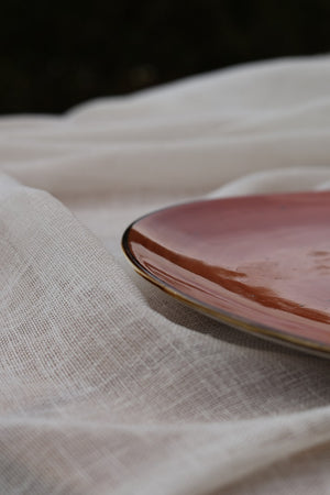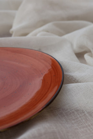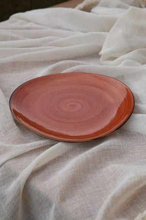 Rich warm burnt-coral plate with swirling brush-stroke texture. Designed for elegant main servings, statement plating and beautiful tablescapes. Earthy, modern, timeless.