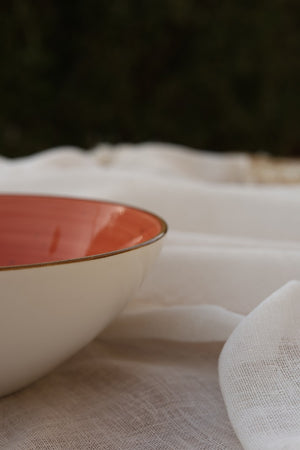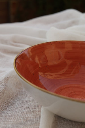 A rich terracotta-toned deep bowl with soft speckled details and a glossy finish. Perfect for pasta, salads, soups or fruit servings. Its warm color brings a natural sunset glow to every table setting.