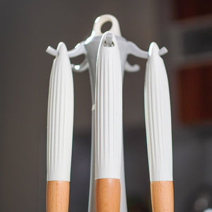 A soft and minimalist addition to your countertop, this wood and ivory-handled set balances simplicity with sophistication. Designed with ribbed grips and a compact stand for a clean, polished look.