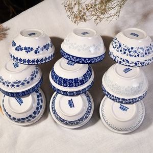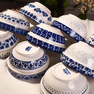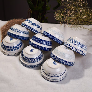 A set of porcelain bowls decorated with traditional blue floral and geometric patterns on crisp white. Ideal for rice, soup, or snacks, blending elegance with heritage.