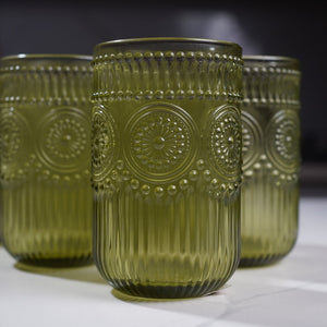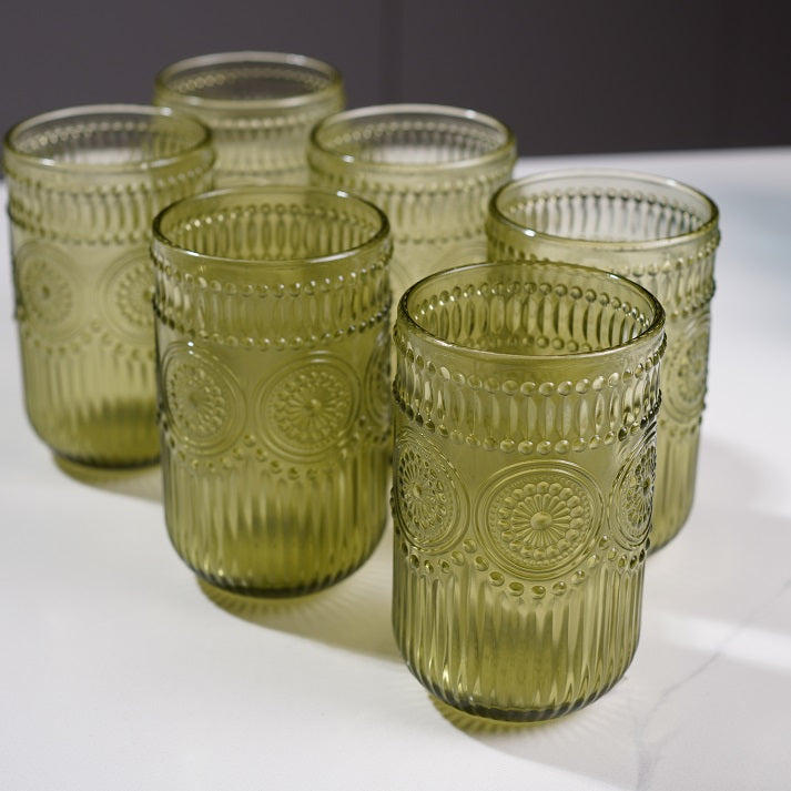 A beautifully crafted set of six glass cups featuring an embossed mandala pattern and dotted texture. These glasses bring a touch of vintage charm to any table, perfect for serving water, juice, or signature drinks. Their thick, durable glass and artistic detailing make them both practical and decorative ideal for daily use or hosting.