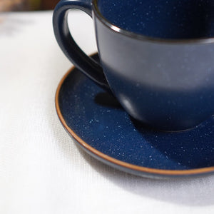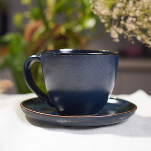 A deep navy blue porcelain cup with a matching saucer, finished with a subtle speckled glaze. Perfect for serving coffee, cappuccino, or tea with timeless elegance.