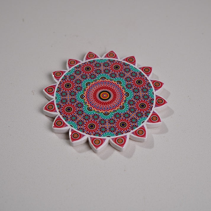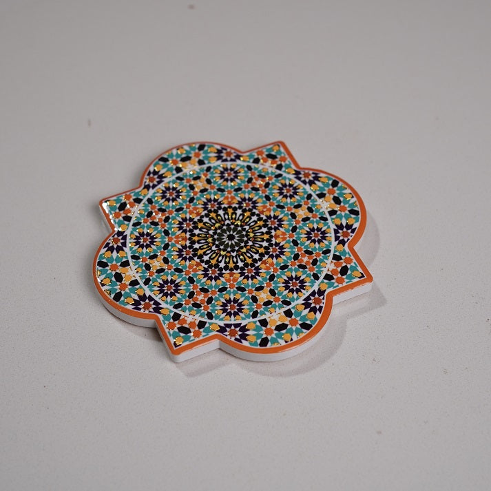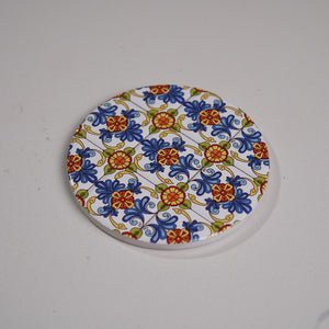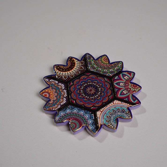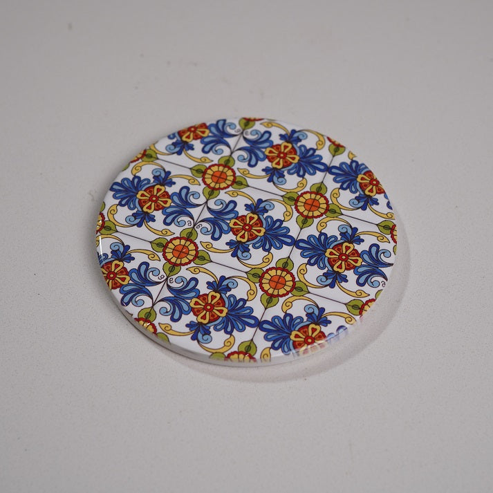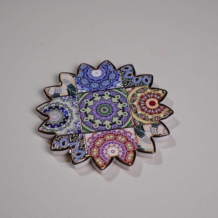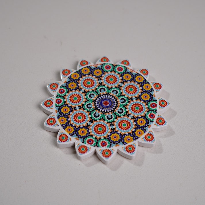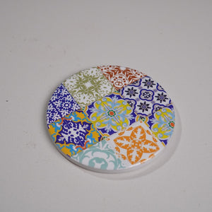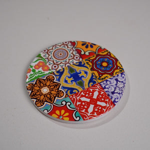 A vibrant round ceramic coaster featuring colorful mosaic-inspired patterns. Perfect for protecting your surfaces while adding a touch of artistic flair to your table setting.