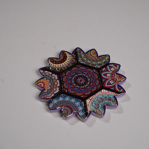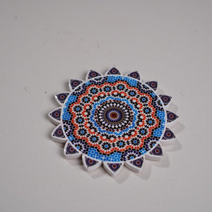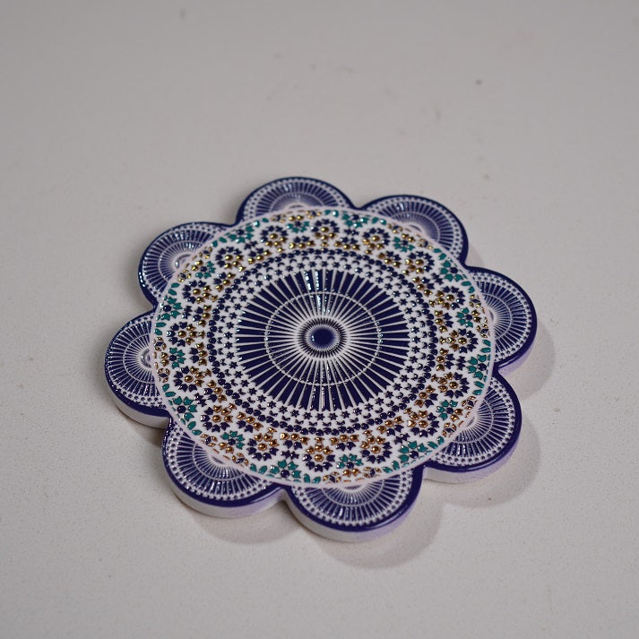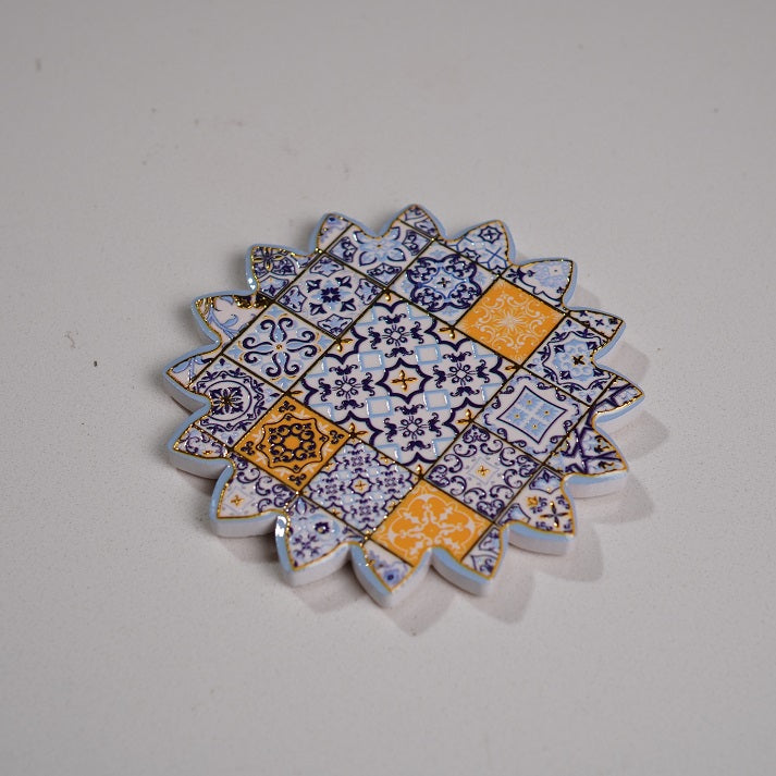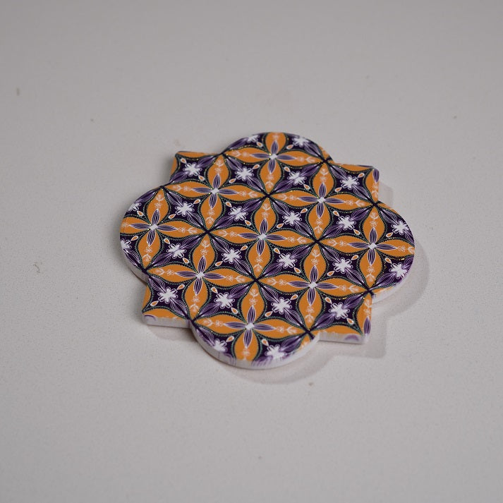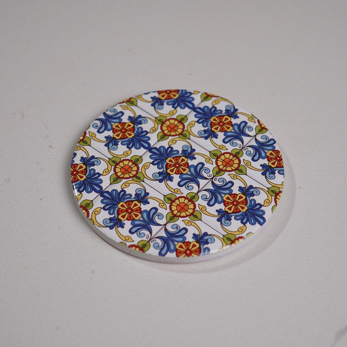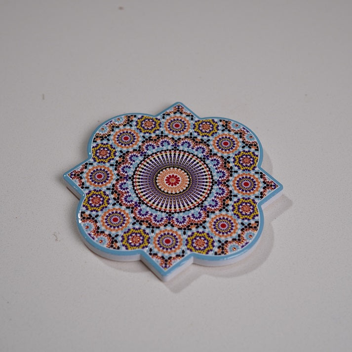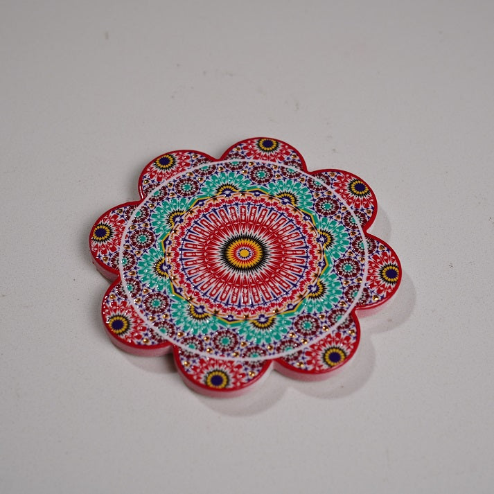 A vibrant round ceramic coaster featuring colorful mosaic-inspired patterns. Perfect for protecting your surfaces while adding a touch of artistic flair to your table setting.