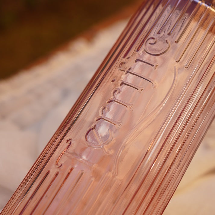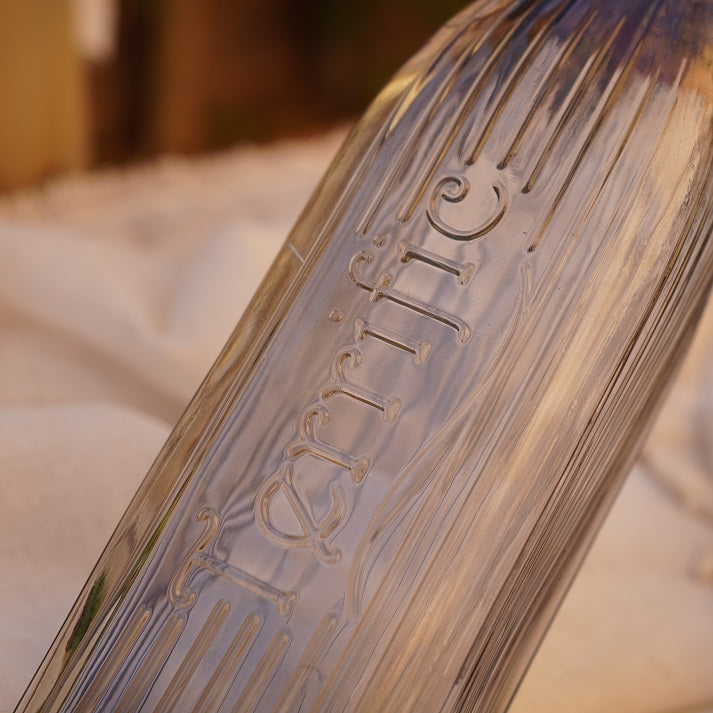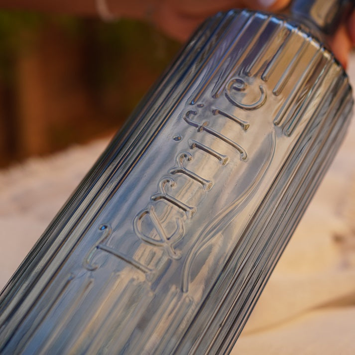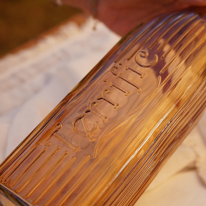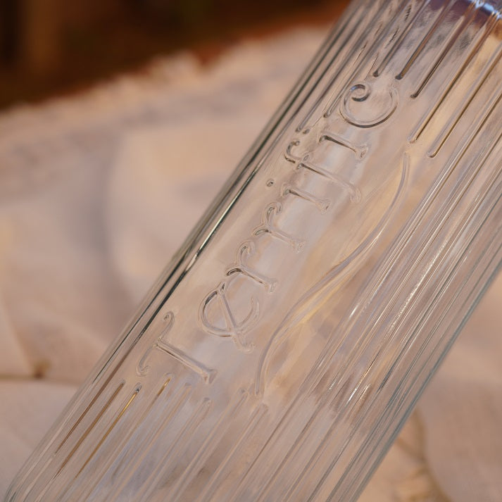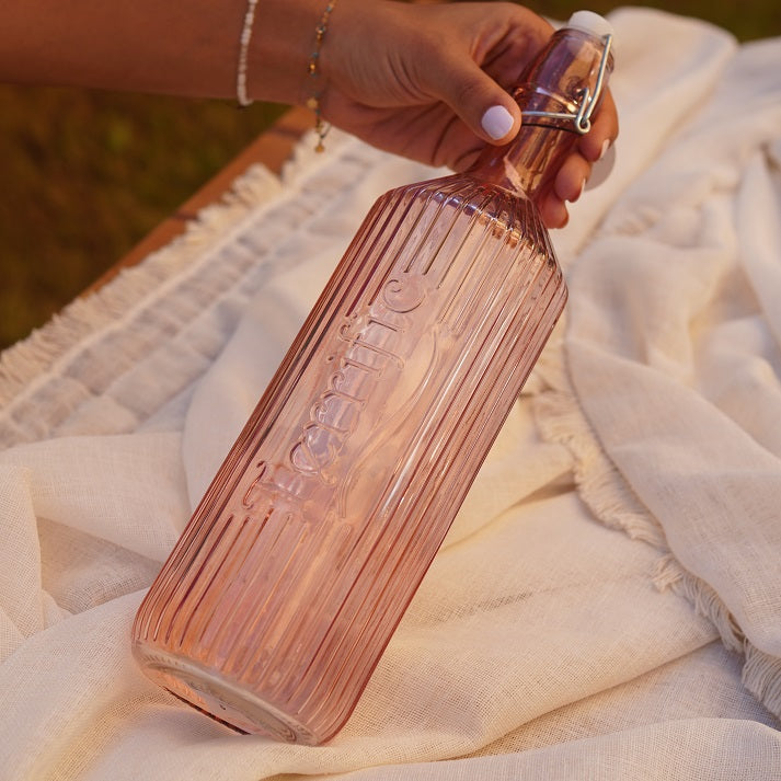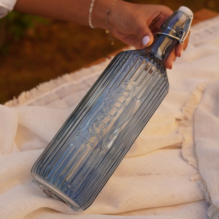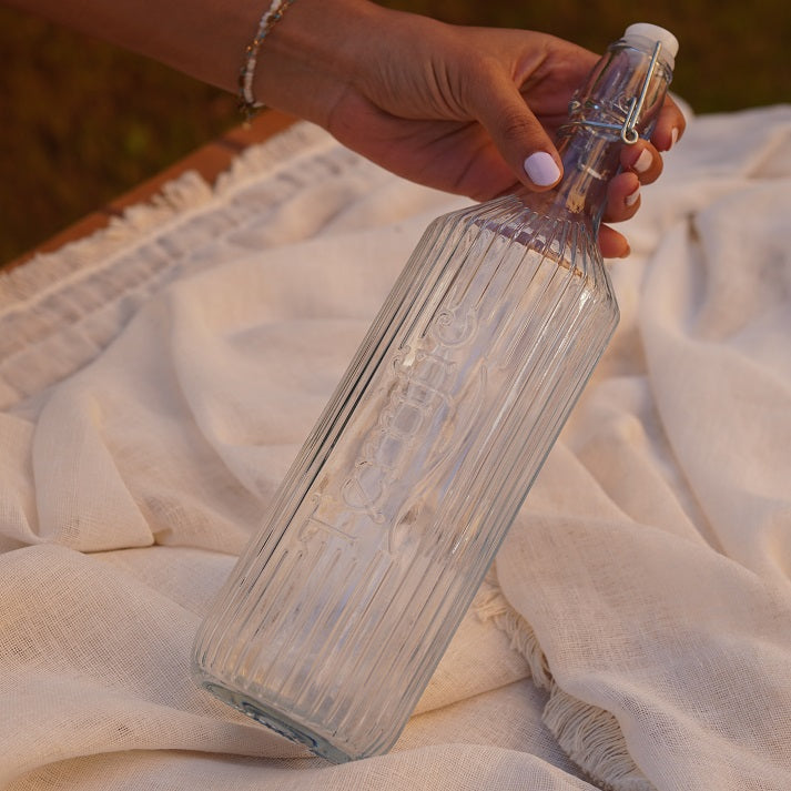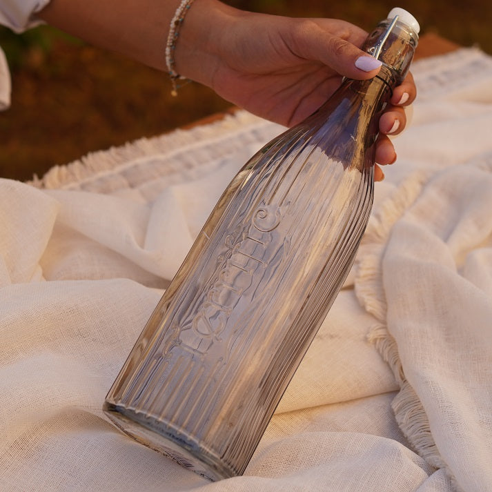 A stylish amber-tinted glass bottle featuring a secure clip-top lid, perfect for infused water, juice, or iced drinks. Its ribbed texture adds elegance to both everyday use and outdoor gatherings.
