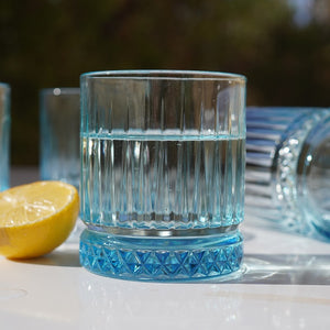 A vibrant set of sky-blue tumblers featuring a detailed crystal-cut pattern that beautifully catches the light. Perfect for daily drinks or styling your table with a refreshing pop of color. Durable, stylish, and modern — an instant mood-booster for any home.