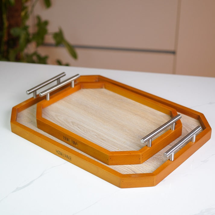 The beautifully crafted wooden trays offer natural elegance and a timeless design, perfect for both serving and organizing. With sturdy handles and a warm wood finish, these trays are a versatile addition to any home.