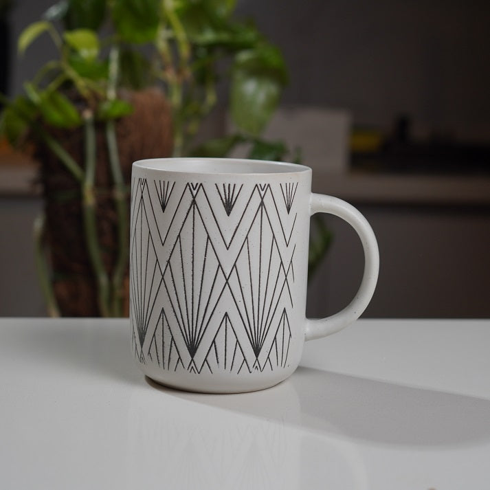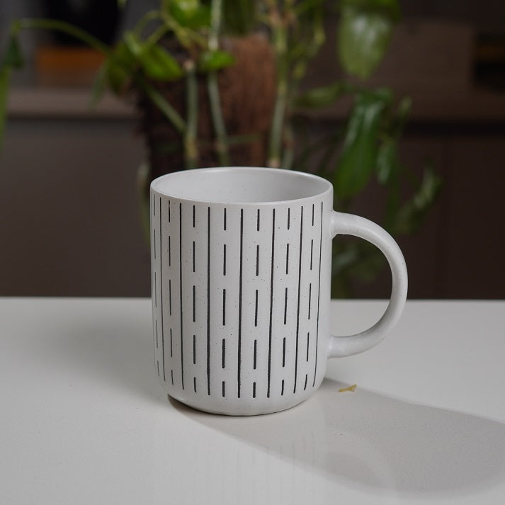 A white porcelain mug decorated with bold black geometric lines. A stylish and modern choice for coffee lovers.