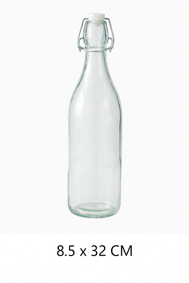A clear glass bottle with a secure swing-top lid, ideal for storing water, juices, or homemade drinks. Stylish and reusable, it’s perfect for both dining tables and fridge storage.