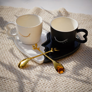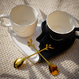 This charming set of two porcelain mugs showcases a playful contrast with one black and one white mug, each resting on a uniquely shaped saucer that fits together like puzzle pieces. The whimsical, minimalist face design on both mugs adds a touch of personality, while the gold-toned leaf-shaped spoons complement the set's artistic vibe, making it perfect for a stylish coffee or tea experience.