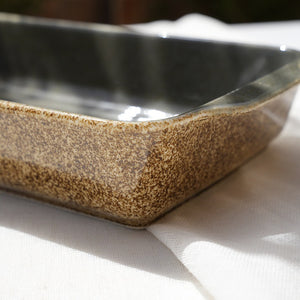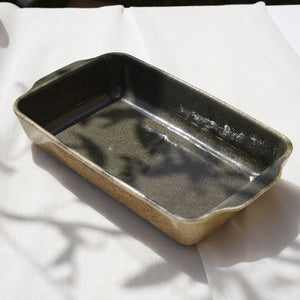 A sleek rectangular baking dish with a dark, glossy interior and rustic outer finish. Designed for oven-to-table elegance, ideal for lasagna, casseroles, and baked dishes.