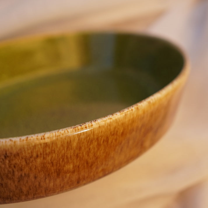 A handcrafted stoneware baking dish featuring an earthy brown exterior and a rich olive-green glazed interior. Its artisanal texture brings nature to your table ideal for oven-to-table serving of lasagna, baked pasta, vegetables, and family favorites.