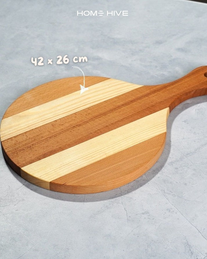 A round wooden board with striped detailing, great for chopping, kneading dough, or presenting cheeses and baked goods.
