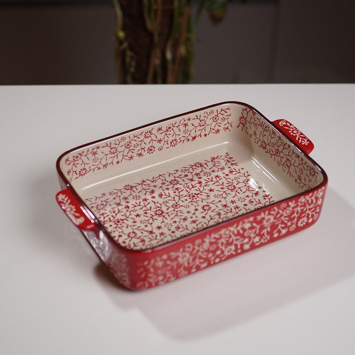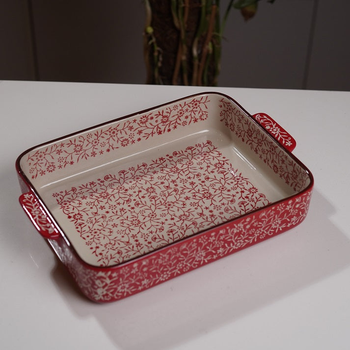 A rectangular ceramic baking dish with a red floral design. Ideal for lasagna, casseroles, and oven-to-table serving.