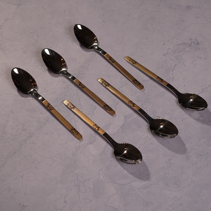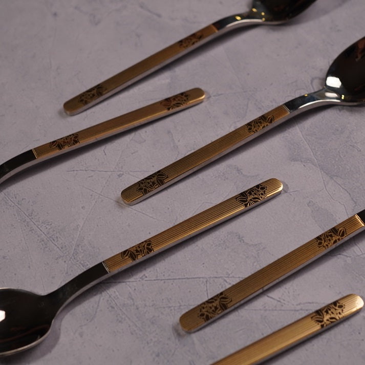 Small-sized spoons designed for tea, coffee, and desserts. Finished with golden engraved handles to bring sophistication to every sip.