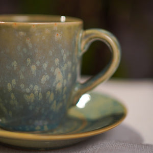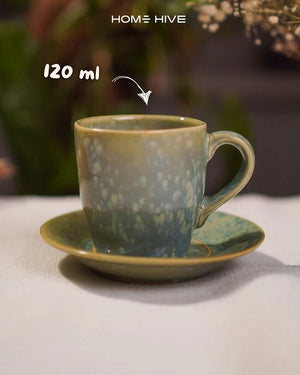 A porcelain cup with earthy green tones and speckled detailing, paired with a matching saucer. Adds a rustic charm to your tea or espresso moments.