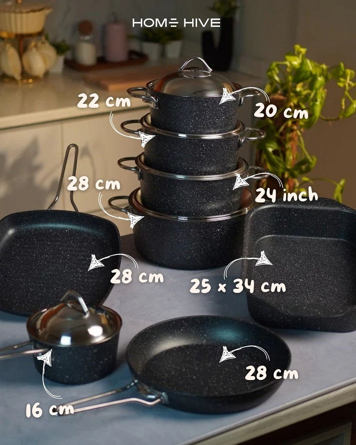 Bring warmth and performance to your kitchen with this stone-textured non-stick cookware set. The natural speckled finish pairs with heat-resistant handles and glass lids, ensuring comfort, style, and cooking efficiency. Includes saucepans, casseroles, and a frypan for versatile meal prep.