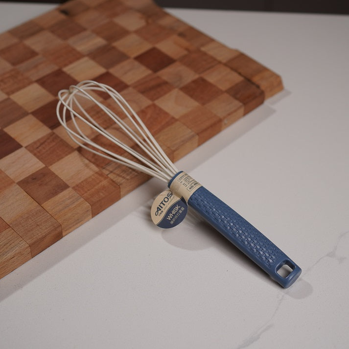 A lightweight whisk with a green or blue textured handle for a secure grip. Perfect for whisking eggs, creams, and sauces smoothly.